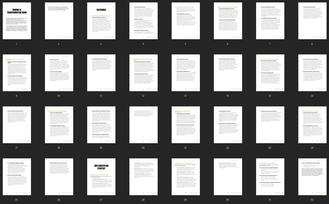 Offer your customers a powerful prompt pack that equips them with the tools to lead confident, effective AI transformations. Whether they’re just beginning or scaling adoption, this pack gives them practical prompts to communicate clearly, build trust, and make AI work for their organization.